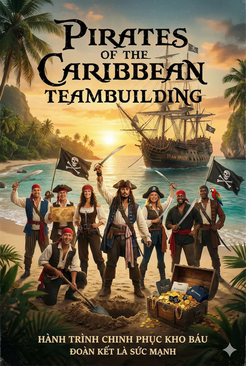 Nếu bạn muốn tổ chức một chương trình Teambuilding vừa kịch tính, vừa vui nhộn, lại mang màu sắc phiêu lưu thì Teambuilding theo concept Teambuilding Pirates of the Caribbean (Caribbean) là lựa chọn lý tưởng. Lấy cảm hứng từ thế giới cướp biển, đảo hoang và kho báu huyền thoại, chương trình đem đến cho đội ngũ cảm giác như đang tham gia một bộ phim phiêu lưu trên biển với đầy đủ yếu tố: bí ẩn, thử thách, liên minh và bất ngờ.